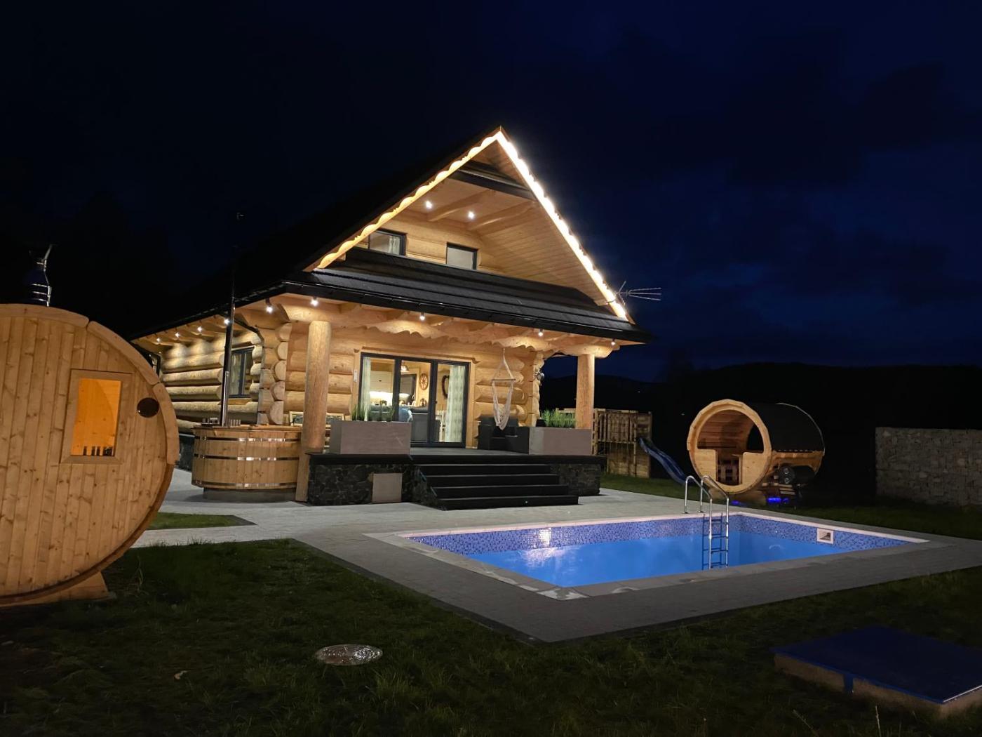 Domek. This chalets standout features are the infinity pool, sauna and fireplace. Boasting a private entrance, this air-conditioned chalet comes with 1 living room, 4 separate bedrooms and 3 bathrooms with a bath and a shower. Guests will find a stovetop, a refrigerator, a dishwasher and kitchenware in the well-equipped kitchen. The chalet also includes a barbecue. The spacious chalet features a washing machine, soundproof walls, a coffee machine as well as a terrace with garden views. The unit has 7 beds. Domek - 11 osobowy. Powierzchnia pokoju ok.: 174 mkw.